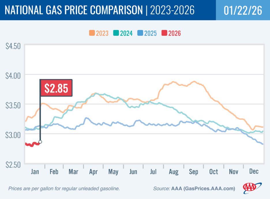January 23, 2026 - WASHINGTON, DC – As winter weather grips much of the nation and fewer drivers hit the road, gas prices remain low with the national average at $2.85. Gasoline demand is lowest during this time of year, keeping the price of crude oil in the high $50 – low $60 range. Demand begins to ramp up toward the end of February and early March as the weather starts getting milder, and travelers take Spring Break trips.