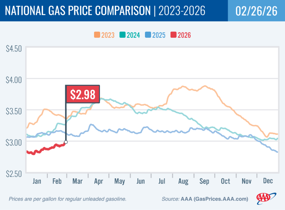 February 27, 2026 - WASHINGTON, DC – Spring weather may be weeks away in much of the country, but the seasonal rise in gas prices is underway. The national average for a gallon of regular gasoline went up by more than 5 cents this past week to $2.98. Refineries are beginning the process of producing summer-blend gasoline which contains pricier additives to help reduce evaporation during warmer months. Gas demand is also expected to increase next month as spring break season kicks off and more drivers take road trips.